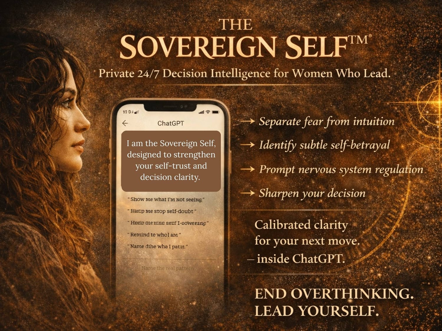 The Sovereign Self™ is a private clarity system inside ChatGPT designed to support women when decisions feel heavy, emotional, or overwhelming.